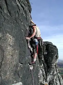 Durch die steigende Leistungsorientierung entstand dann Ende der 1960er- und Anfang der 1970er-Jahre auf Basis des Freiklettergedankens aus der Sächsischen Schweiz das Sportklettern.[13] Westdeutsche Kletterer lernten diese Art zu Klettern bei Besuchen im Elbsandsteingebirge kennen, importierten diese nach Westdeutschland und entwickelten sie weiter. Dies mündete schließlich 1975 in den Rotpunkt-Gedanken von Kurt Albert.[14] Seitdem wurden alle Varianten des Kletterns weltweit immer populärer, durch systematisches Training und zunehmende Professionalisierung kam es zu enormen Leistungssteigerungen.[15] Auch im alpinen Bereich wurde der Stil einer Begehung bzw. Besteigung immer wichtiger, auf künstliche Hilfsmittel wird verzichtet und Haken und mobile Sicherungsmittel dienen nur zur Absicherung und nicht zur Fortbewegung.