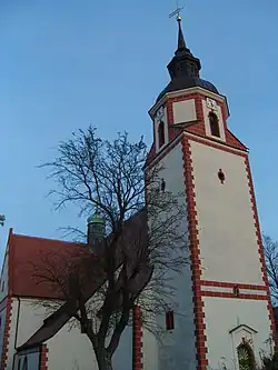 Ältester Bau ist die Vorhalle der heutigen evangelischen Kirche, die bereits zum Zeitpunkt der Ersterwähnung des Ortes bestand, darauf weisen Fundamentfunde im Umfeld der Kirche hin. Zur Zeit der Reformation wurde die Kirche als einschiffiger Bau mit Glockenturm errichtet wurde, das Langhaus existiert heute noch. Im Jahre 1774 erfolgte eine barocke Umgestaltung der Kirche. Der Turm wurde auf die heutige Höhe von 40 Metern ausgebaut.[7] Vor der Kirche befindet sich ein Denkmal für die Gefallenen des Ersten Weltkriegs. Ein Denkmal für die Gefallenen des Deutsch-Französischen Kriegs befindet sich am Dorfplatz.