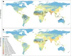 Die theoretische menschliche Populationsdichte entspricht im Jahresverlauf einer Bimodalverteilung der geeigneten Durchschnittstemperaturen zweier Modi; einem um 15 °C, einem zwischen 20 und 25 °C.[2] Für die Lebensmittelsicherheit notwendige Ernteerträge und Nutztiere sind von ähnlichen ökologischen Nischen abhängig. Auch Faktoren wie Luftfeuchtigkeit können die Größe der Klimanische direkt (bspw. saisonal durch Erreichen der Feuchtkugeltemperatur)[3][4][5] oder indirekt (etwa Erkrankungen, Nahrungsausfälle) beeinflussen. Mit dem Anstieg der globalen Durchschnittstemperaturen wird prognostiziert, dass weite Teile der Weltbevölkerung Umweltbedingungen außerhalb der menschlichen Klimanische ausgesetzt sein werden. Einige Prognosen unter Einbeziehung des demographischen Wandels gehen davon aus, dass sich zwischen 2030 und 2090 etwa 2,0 bis 3,7 Milliarden Menschen außerhalb der Klimanische aufhalten werden.[2][6][7] Bei global gleichbleibender Bevölkerungszahl und einem derzeit realistischen Szenario von 2,7 Grad Celsius Erwärmung könnte dies beispielsweise für Deutschland einen absehbaren Zustrom von 67 Millionen Menschen bedeuten.[8]