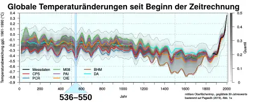 Pressemitteilung dazu: Researchers find new evidence that large eruptions were responsible for cold temperature extremes recorded since early Roman times. Desert Research Institute, 8. Juli 2015, archiviert vom am 16. Juli 2015; abgerufen am 9. August 2015. - ↑ Raphael Neukom, Nathan Steiger, Juan José Gómez-Navarro, Jianghao Wang, Johannes P. Werner: No evidence for globally coherent warm and cold periods over the preindustrial Common Era. In: Nature. 24. Juli 2019, doi:10.1038/s41586-019-1401-2.