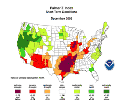Eine weitere Gefahr, die von Dürren ausgeht, ist die verstärkte Anfälligkeit der Vegetation für unkontrollierte Brände[12]. Den gesamten wirtschaftlichen Schaden, der durchschnittlich jährlich durch Dürren in den USA bedingt ist, beträgt laut einer Studie des National Drought Mitigation Center 6 – 8 Milliarden US-Dollar[13]. Dürren sind schwer vorherzusagen, da sie sich über einen längeren Zeitraum entwickeln und so dem verlässlichen Vorhersagefenster der Wetterdienste entziehen. Daher ist eine laufende Beobachtung und Bewertung von Trockenperioden und der Vergleich mit historischen Daten nötig. Diese Aufgabe übernehmen das Climate Prediction Center[14], das Teil der National Oceanic and Atmospheric Administration (NOAA)[15] ist, sowie verschiedene universitäre Einrichtungen, wie beispielsweise das bereits erwähnte National Drought Mitigation Center (NDMC)[16] der University of Nebraska-Lincoln. Die gesammelten Daten zu Niederschlagsmenge, Evapotranspiration, Wasserstand und Bodenfeuchte werden dann durch verschiedene Indizes in Gefahrenkategorien eingeteilt und auf Karten übersichtlich dargestellt[17]. Es gibt verschiedene Indizes, die sich jeweils für unterschiedliche Anwendungsgebiete eignen und nach Gebietsgröße der Vorhersage, Lage des Gebiets und anderen Kriterien ausgewählt werden[18]. Der am weitesten verbreitete Index ist der Palmer Drought Severity Index (PDSI), welcher in 11 Klassifikationen eingeteilt ist und von vielen US-Regierungsinstitutionen genutzt wird[19]. Der PDSI, der schon Mitte der 1960er-Jahre entwickelt wurde, ist mittlerweile mehrfach weiterentwickelt und modifiziert worden und wird nun neben anderen Indizes wie dem Standard Precipitation Index (SPI) oder dem Reclamation Drought Index (RDI)[20] genutzt bzw. von diesen ergänzt[21].