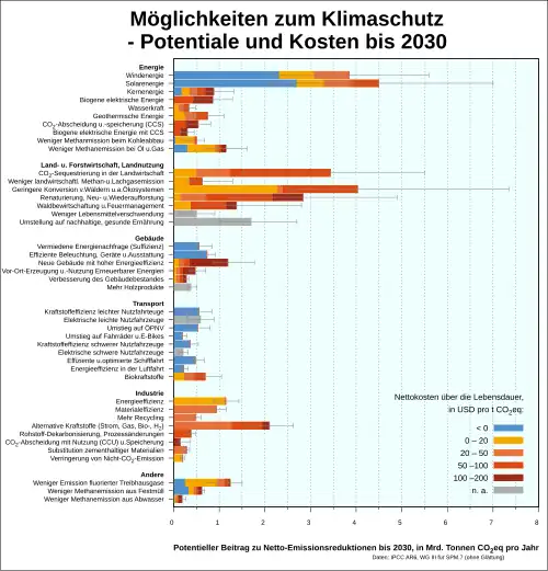 Auf technischer Ebene existiert eine Vielzahl von Optionen zur Verminderung der Emission von Treibhausgasen. So ließe sich auch mit heutigen Mitteln ein effektiver Klimaschutz realisieren.[10] Dies bestätigt der 5. Sachstandsbericht des IPCC. Das Erreichen von Klimaschutzzielen erfordert in jedem Fall einen grundlegenden Umbau der Energieversorgung, unabhängig davon, ob die Erderwärmung auf 1,5 °C, 2 °C oder 3 °C begrenzt werden soll; Unterschiede ergeben sich dabei nur in Bezug auf die Geschwindigkeit des Umbaus, nicht aber hinsichtlich dessen grundsätzlicher Notwendigkeit. Je später der Klimaschutz jedoch aufgenommen wird, desto teurer wird er – zusätzlich zu den nicht vermiedenen Schäden vor und nach dem Beginn – und desto notwendiger wird der Einsatz riskanter Techniken. Ohne Klimaschutz ist dagegen eine Erderwärmung von 4 °C und mehr bis Ende des 21. Jahrhunderts nicht auszuschließen, sie wäre mit nicht abzuschätzenden Risiken verbunden.[11]