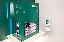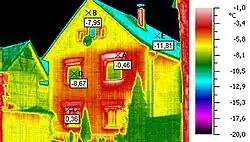 - Gute Dämmung der Gebäudehülle (Dach, Fassaden, Fenster, Kellerdecke) und Einsatz von energieeffizienten Brennwertgeräten oder Wärmepumpen[68] führt zum Niedrigenergiehaus oder zum KfW-geförderten Passivhaus. Zum Beispiel könnte (Stand 2007/8) die Stadt Freiburg im Breisgau durch gute Isolation der Wohngebäude 58 Prozent der CO2-Emissionen vermeiden.[69] Zu den in der praktischen Umsetzung erfolgreichsten europäischen Kommunen gehört die Stadt Delitzsch. Dort konnte zwischen 1990 und 2007 die Kohlendioxidemission um 60 Prozent gesenkt, der Endenergieeinsatz um 22 Prozent und der Primärenergieeinsatz um 24 Prozent reduziert werden.[70]