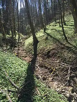- (Linker Quellast des vorigen), von links und Süden auf etwa 665 m ü. NHN östlich des Häufelsbergs schon im Steinhofener Wald, 0,7 km und ca. 0,6 km².[9] Entsteht auf etwa 775 m ü. NHN im Bisinger Wald unterm Hundsrücken (931,1 m ü. NHN), der nach Norden im Häufelsberg tiefer ausläuft. Quellast mit dem größeren Einzugsgebiet.