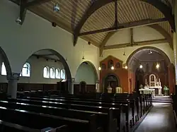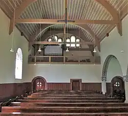 Die Seitenwände sind weiß verputzt, die Holzelemente in hellem Ockergelb gestrichen. Die Fensterlaibungen und die Scheidbögen der Säulen zwischen den beiden Kirchenschiffen sind ebenfalls farbig gestrichen.
