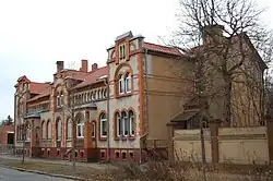Das Gebäude wurde 1894/1896 durch den Baumeister Robert Riefenstahl gebaut. Die Fassade des an einen Palas erinnernden Hauses ist im Stil der Neoromanik gestaltet. Ihre hellen Putzflächen werden durch rote Klinker gegliedert.