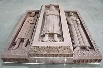 In der Mitte Graf Eberhard († 1078/79) als Gründer und Stifter des Klosters mit dem Kirchenmodell im Arm, nördlich (im Bild rechts) seine Gemahlin, Gräfin Ita († nach 1100), Gründerin des Doppelklosters St. Agnes, und südlich ihr Sohn Burkhard († 1101/02) mit Bäumchen oder Halm mit Wurzelballen (festuca) in den Händen, welches die Schenkung symbolisiert.