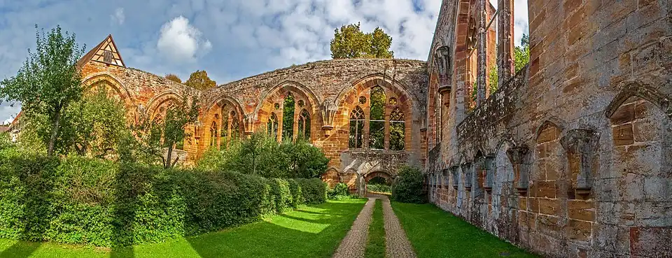 Die Ruine der ehemaligen Klosterkirche beeindruckt durch die Monumentalität der noch stehenden hohen Außenmauern aus hellbraunem Sandstein sowie durch das gotische Maßwerk ihrer großflächigen Fensteröffnungen. In der Südostwand befindet sich als einziges erhaltenes Grabdenkmal das lebensgroße Relief-Epitaph des 1466 verstorbenen Ritters Martin von Wildenstein, der 1460 einen Himmelfahrtsaltar und Geld für Glasgemälde gestiftet hatte; das Hochgrab der Stifterin Katharina († 1426) vor dem Brüderchor ist verschwunden. Außen sind die Strebepfeiler einmal abgesetzt und einfach abgedacht. Die Grundfläche der ehemaligen Hallenkirche beträgt 70 mal 37 Meter. Die Kirchenruine ist wegen eines Privatgartens, unter dem die Pfeilersockel vermutet werden, nur teilweise zugänglich. Nicht zugänglich sind auch die Reste des ehemals gewölbten Kreuzgangs im ehemaligen Klosterhof und des Nonnenklosters, das ein Viereck bildete, von dem sich der nordöstliche Flügel erhalten hat. Die Umfassungsmauern der gesamten Klosteranlage sind teilweise noch vorhanden.