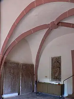 Das Kirchenschiff, das im Laufe von 200 Jahren baufällig geworden war, musste 1566 einem Neubau weichen. Die Turmhalle, deren Erneuerung bereits im 15. Jahrhundert begonnen hatte, erhielt ein zweijochiges Rippengewölbe, das ohne Kapitelle aus mehrseitigen Wandpfeilern strebt. Einer der beiden Schlusssteine trägt noch schwach erkennbar das Wappen des Mainzer Erzbistums mit der üblichen Anordnung der Mainzer Räder, der andere, nur als Fragment erhaltene, vermutlich das Wappen des Erzbischofs Dietrich Schenk von Erbach mit den Erbacher Sternen. 1453 wurde der Turm um eine Klangarkade in Form von schmalen Mauerdurchlässen mit Rundbögen erweitert.