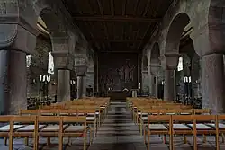 Die erhaltenen Bauglieder – die vier Joche des Langhauses sowie die Stümpfe der beiden Westtürme mit der dazwischen liegenden Vorhalle – sind heute im Stil einer Hallenkirche gedeckt, also ohne Obergaden. Im Inneren schließt sie eine Holzdecke nach oben ab. Die Durchgänge zum abgerissenen Querhaus sind zugemauert. Das Mittelschiff verschließt gen Osten eine Wand mit figürlichen Tiefreliefs von Bildhauer Otto Herbert Hajek, der 1955 auch Altar und Tabernakel geschaffen hat. Wilhelm Geyer gestaltete 1955 die acht kleinen Fenster im Schiff, zwei Fenster in der Sakristei und das Oberlicht in der Vorhalle.[8]