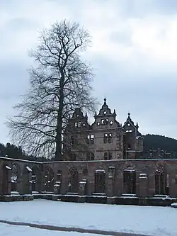 Während einer Belagerung durch französische Truppen unter General Mélac im Pfälzischen Erbfolgekrieg gingen Schloss und Kloster am 19. Septemberjul. / 29. September 1692greg. in Flammen auf. Fehlten zunächst meist nur die Dächer, verlor die Anlage bis 1808 zunehmend auch Mauerwerk, das man u. a. für den Wiederaufbau von Calw verwendete.[18] Erhalten blieben vollständig nur die spätgotische Marienkapelle und der 37 Meter hohe romanische Nordturm (Eulenturm) der Doppelturmfassade am Westzugang der Basilika. Die Lage des südlichen Gegenstücks ist an den freigelegten Grundmauern erkennbar. Vom Schloss und dem spätgotischen Kreuzgang (1474–1503) stehen noch die Umfassungsmauern aufrecht. Kirche und Klausur blieben lediglich in den Grundmauern erhalten. Im Ostflügel des Schlosses wuchs bis 1989 die berühmte Ulme zu Hirsau, der Ludwig Uhland 1829 sein Gedicht Ulmenbaum widmete.[19]