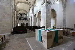Die Klosterkirche ist eine romanische Basilika mit dreiteiliger Choranlage mit Apsidenschluss, ausladendem Querhaus, dreischiffigem Langhaus und ehemals zweitürmiger Westfassade, deren nördlicher Turmaufsatz nach Zerstörung im Dreißigjährigen Krieg nicht wiedererrichtet wurde. Der heute steinsichtige Außenbau wird von der klaren kubischen Gestaltung der Baukörperform ohne jegliche Artikulation durch Gesimse oder Lisenen bestimmt, und auch die Portale sind durch ihre reine Rahmenform ohne Relief bestimmt. Der Kirchenraum ist, wie der wie der Speyerer Dom (seit dessen Ausbau von 1080–1106), im gebundenen System über rechteckige Wandvorlagen mit Viertelkreisabkragungen und Gurtbögen kreuzgratgewölbt, die Seitenschiffsarkaden werden von Zwischenpfeilern getragen, deren abgefaste Kanten durch Ecksäulen mit Würfelkapitellen betont sind. Die Gewölbe haben rundbogige Gurt- und Schildbögen, aber die Grate verlaufen in Vierung und Querhaus schon etwas spitzbogig, gehören zu den frühesten Spitzbogengewölbe in Deutschland, sind aber wohl jünger als die ersten ebenfalls spitzbogigen Bandrippengewölbe des Wormser Doms.[2]