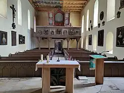 Das Schiff ist ein einfacher Rechtecksaal mit flacher Balkendecke. Die Orgelempore wurde an der Westwand angebaut. Im Raum befinden sich zwei Schnitzretabeln aus der Zeit um 1475 bzw. 1490. Die ebenfalls aus Holz geschnitzte Kanzel aus dem Anfang des 18. Jahrhunderts steht auf einer gedrehten Säule. Der gotische Taufstein in Form eines Kelches wurde im 19. Jahrhundert überarbeitet. An den Wänden sind mehrere Gemälde aufgehängt, die u. a. Bildnisse von Stiftsdamen aus dem 17. und 18. Jahrhundert bieten. In einer Nische der Eingangshalle befindet sich ein Vesperbild als Hochrelief aus Sandstein aus dem letzten Viertel des 14. Jahrhunderts.