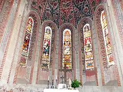 Die Ostteile sind weitgehend einheitlich gestaltet. An Chor und Querschiff finden sich kräftige Strebepfeiler, unter dem Traufgesims läuft ein Kreuzbogenfries. In den polygonal gebrochenen Apsiden von Chor und Südquerhaus sind ungeteilte Lanzettfenster in doppelter Blende angeordnet. Die Apsis des älteren Nordquerhauses ist im Unterteil leicht dreipassförmig. Dort sind zwei Bänder von je drei Fenstern angeordnet, deren untere lanzettförmig, die oberen kleiner und nahezu rundbogig ausgeführt sind.