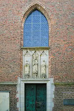 In der Westfassade der Kirche befindet sich unter einem gotischen Spitzbogenfenster eine dreigeteilte Blende, die oberhalb des Portals eingelassen ist. In ihr befinden sich in Maßwerknischen drei Sandsteinfiguren, die 1939 geschaffen wurden. In der Mitte steht die hl. Maria mit dem Jesuskind, rechts die heilige Monika und links ihr Sohn, der heilige Augustinus. Sie ersetzen teilweise verwitterte Figuren aus dem 15. Jahrhundert, die sich heute im Kircheninneren befinden.