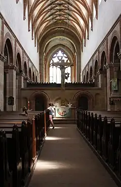 Die Kirche ist eine dreischiffige Basilika, die in den Jahren 1147 bis 1178 zunächst in romanischem Stil erbaut wurde. Verglichen mit derjenigen des Klosters Pontigny ist sie um ein Drittel kürzer, aber nur um ein Achtel schmaler. Wie jene (und mehrere andere Zisterzienserkirchen) vereinigt das langgestreckte Gebäude in sich zwei Kirchen, die Laien- und die Mönchskirche. Auch mittelalterliche Kathedralen hatten üblicherweise einen geräumigen Chor, dort für die Domherren. Ein romanischer Lettner trennt die Laienkirche, hier Bruderchor genannt, von der Mönchskirche, dem sogenannten Herrenchor. Vor dem Lettner steht ein monumentales Kruzifix von Conrat Seyfer aus dem Jahr 1473, bei dem Kreuz und Körper des Heilands aus einem einzigen Steinblock herausgemeißelt wurden.[7][8]
