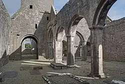 Der nördlich der Kirche liegende Klostergarten hat vier umlaufende Arkaden, davon war die sich an das Kirchenschiff anlehnende Südseite einfach überdacht, die anderen drei sind in die jeweiligen Nebengebäude integriert und mit einem Tonnengewölbe versehen. Harold G. Leask und Roger Stalley sehen die Ähnlichkeit der Arkaden mit denen von Ross Errilly, so dass sie mindestens auf das Ende des 15. Jahrhunderts, möglicherweise auch später geschätzt werden.[64][61] Die Ähnlichkeiten sind so groß, dass davon ausgegangen wird, dass dies Arbeiten der gleichen Steinmetze sind.[64][65] Roger Stalley sieht hier auch genügend Ähnlichkeiten zu den Arkaden in Creevelea:[61]