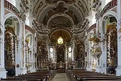 Egid Quirin Asam und Cosmas Damian Asam haben den Innenraum gestaltet. Wegen der üppigen Gestaltung im Inneren mit reichem Stuck gilt das Bauwerk als ein Meisterwerk spätbarocker Kirchenbaukunst. Das riesige Deckenfresko von 1732 zeigt Szenen aus dem Leben des Gründers der Prämonstratenser Norbert von Xanten. Unter dem Turm porträtierte der Maler Cosmas Damian Asam sich selbst als reumütigen Zöllner.