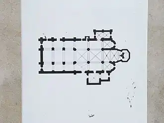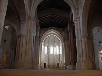 Die basilikal angelegte und insgesamt trotz ihrer späten Bauzeit eher romanisch anmutende vierjochige Kirche endet in einer polygonalen Hauptapsis und zwei halbrunden Seitenapsiden; alle drei Apsiden verfügen über Rundbogenfenster mit zwei Archivolten, die auf Säulen mit Pflanzenkapitellen ruhen. Alle drei Apsiden wie auch einige Joche der Kirchenschiffe haben gotische Kreuzrippengewölbe, wohingegen das Querhaus lediglich einfache Tonnengewölbe zeigt. An die Hauptapsis wurde im 16. Jahrhundert eine zweitürige Sakristei angebaut. Vom vierten Joch im Süden der Kirche führte ehemals eine Tür zum Kreuzgang und zu den übrigen Klostergebäuden (Kapitelsaal, Dormitorium, Refektorium etc.)