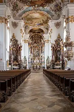 Vermutlich wurde der Stuck von Stuckateuren der Wessobrunner Schule gefertigt. Die Deckenfresken schuf der Maler Franz Martin Kuen. Sie gelten als dessen Hauptwerk, sind aber großteils nicht erhalten, da die Decke 1845 einstürzte. Nach deren Wiederherstellung wurden 1900 neue Fresken durch den akademischen Maler Waldemar Kolmsperger angebracht. Wie in vielen Kirchen der Prämonstratenser stellt das zentrale Deckengemälde das Weihnachtsgeschehen dar, ein Hinweis auf die Gründung des Ordens am Weihnachtsfest 1121.