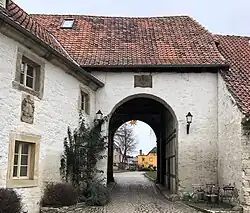 Als Eingang zum Klostergelände besteht hier ein 1780 errichtetes Torhaus, durch das eine rundbogig überspannte Durchfahrt führt. Dominant ist ein großer Taubenturm, der 1994 grundlegend rekonstruiert wurde. Oberhalb der Durchfahrt besteht an der Außenseite nach Osten ein Zwerchhaus. Es ist mit einem kleinen Vesperbild versehen. Oberhalb des Versperbildes befindet sich eine Reliefdarstellung von Gertrud von Hakeborn, der ersten Äbtissin des Klosters. Über der zum Hof weisenden Westseite der Tordurchfahrt findet sich eine Darstellung des Wappens des Klosters.