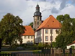Die etwas erhöht an der Nordostecke des Gutshofs gelegene barocke Saalkirche wurde 1724–1733 errichtet. Die Bruchsteinwände des Kirchenschiffes werden von jeweils drei hohen rundbogigen Fenstern durchbrochen, dazwischen sind schlichte Strebepfeiler angeordnet.[6] Der Turm ist in ähnlicher Bauweise im Westen angesetzt, sein nahezu quadratischer Grundriss geht in Höhe des Kirchendaches in eine achteckige Form über. Den Abschluss bildet eine verschieferte barocke Haube.
