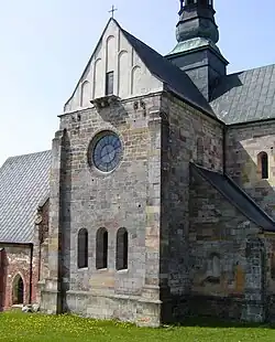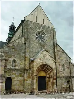Die Kirche, ein spätromanischer Hausteinbau, wurde 1232 geweiht und 1923 bis 1928 und 1946 bis 1950 restauriert. Sie gehört mit Kloster Koprzywnica, Kloster Wąchock und Kloster Jędrzejów zu einer mit der Bauhütte des italienischen Meisters Simon zu verbindenden Gruppe.