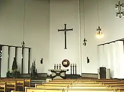 Die Klosterkirche entstand nach den Entwürfen des Architekten Silberkuhl aus Essen als modernster sakraler Kirchenbau des Sauerlandes. Unter Verzicht auf eine Ausschmückung der Fassaden zeigt die Kirche die neue Formensprache einer modernen Bautechnik, die auf reine Flächenwirkung setzt. Das in die schlichte geschwungene Betonfläche eingelassene Fensterrelief lockert zwar die Wandfläche auf, vermittelt aber in seiner klaren geometrischen Formensprache den Ausdruck eines kühlen Funktionalismus. Der in sich geschlossene Baukörper vermittelt insgesamt ein gelungenes Zusammenspiel von Moderne und Spiritualität. Die Kirche wurde in den Jahren 1986/87 restauriert. Eingangstüren, Altar und Kreuz wurden durch phantasievolle Werke aus Bronze und Stein neu gestaltet. Hervorzuheben ist der Tabernakel im Mittelpunkt der Chorraumschale, der mit einer in rotem Glasmosaik ausgestalteten Scheibe optisch hervorgehoben wurde.[10]