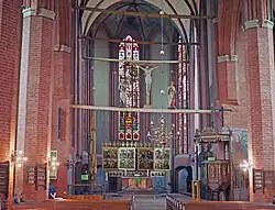 Der Flügelaltar im Chor stammt aus der ersten Hälfte des 15. Jahrhunderts und kann mehrfach aufgeklappt werden. Die Altarflügel des Hauptaltars zeigen in 16 Tafelbildern auf den jeweils zwei Randfeldern Szenen aus dem Leben des heiligen Benedikt, dazwischen in der oberen Reihe sechs Szenen aus dem Marienleben, unten sechs Passionsszenen.