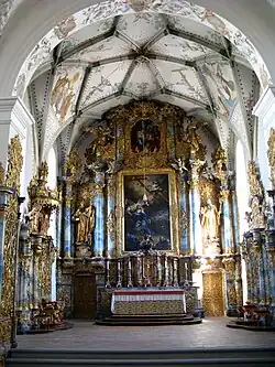 An den Seitenwänden des Hochchors befinden sich der Abtsthron auf der Evangelienseite und die Zelebrantensitze auf der Epistelseite. Die Sessel stehen auf niedrigen Parkettstufen vor geschnitztem Gebälk, das durch Pilaster dreigeteilt ist. Über dem Abtsthron ist zusätzlich ein Baldachin angebracht.[40] Über dem Hochchor ragt ein Sterngewölbe mit dem Wappen von Abt Laurentius von Heidegg.[41]