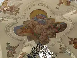 Auf dem Hauptfresko an der Decke der Vierung sind in einem Stuckrahmen in Form einer Vierpass-Variante Christus und die vier Evangelisten mit ihren Symbolen auf Wolken sitzend dargestellt. Acht Engel mit den Arma Christi umgeben das Bild. In Stuckkartuschen, die seitlich an den Vierungsbögen angebracht sind, sieht man die vier Kirchenväter.