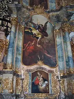 Matthäus Baisch übernahm für die Muttergotteskapelle im nördlichen Querschiffarm mehrere 1683/84 von Johann Baptist Wickart geschnitzte Figuren. Sie stellen die Heiligen Katharina, Barbara, Agatha und Margareta dar. Von Baisch selbst stammen Statuen der Muttergottes und zweier Engel. Das Hauptblatt zeigt den Tod Marias, das Oberblatt Christus mit dem Kreuz auf dem Wolkenthron. Die Hauptfiguren der Benediktkapelle im südlichen Querschiffarm stammen ebenfalls vom früheren Altar. Sie wurden 1660 von einem anonymen Künstler angefertigt und stellen vier benediktinische Äbte dar. Auf dem Hauptblatt ist der Tod des Benedikt von Nursia zu sehen, auf dem Oberblatt die Muttergottes mit zwei Äbten.[36] Das Motiv des Deckengemäldes in der Marienkapelle ist die Krönung Mariens, in der Benediktkapelle die Apotheose des Benedikt von Nursia.[37]