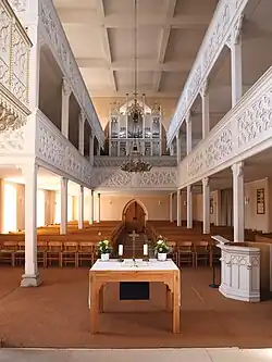 Ursprünglich befand sich im westlichen Teil des Langhauses im Erdgeschoss eine Gruft als Begräbnisstätte der Nonnen, die gelegentlich als Nebenkirche genutzt wurde, und darüber die Nonnenempore. Ein hölzerner Dachreiter war mittig angeordnet. Seit dem Umbau 1856 stehen an den beiden Längsseiten zweigeschossige Empore, an der westlichen Querseite ist diese eingeschossig und trägt die Orgel.[5] Außerdem wurde damals das Langhaus am westlichen Ende durch eine Holzwand mit einer Spitzbogentür in einen Vorraum und den Gemeinderaum geteilt.[6]