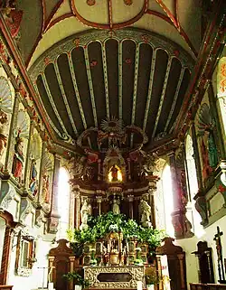 Der Chor mit Dreiachtelschluss wird im westlichen Teil von einem Sternrippengewölbe und östlich von einer großen Muschel überdeckt. Die bunte Ausmalung schuf der in Riedlingen ansässige und vermutlich aus den Niederlanden stammende Hans de Bay.
