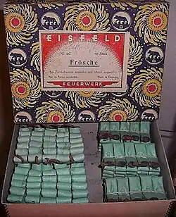 Als Chinaböller werden zylindrische Knallkörper mit chinesischer Zündschnur bezeichnet. Sie werden meist in der Volksrepublik China produziert und von dort importiert und sind in Mitteleuropa weit verbreitet. Typisch ist die Verpackung aus rotem Seidenpapier. Sie sind meist mit Schwarzpulver gefüllt (in Deutschland generell). In Deutschland sehr verbreitete Varianten sind 440 (oft als Pyrocracker bezeichnet), 460 (Chinaböller A), 480 (Chinaböller B), 490 (Chinaböller D), 500 (Superböller I) und 510 (Superböller II). Die Zahlenangaben sind (ehemalige) Normen für die Maße der Chinaböller; heutige Böller sind in der Regel mittlerweile etwas kleiner.[3] Seltener sind die Größen 450 (Petarde) und 470 (Chinaböller C). Als Knallkörperketten werden Böller bezeichnet, die zu Matten gebündelt sind. In Deutschland waren Lady-Cracker (40er oder 70er Matten) und Paket-Cracker (etwas größer, 20er oder 30er Matten) üblich. Früher gab es diese kleinen Knallkörper auch einzeln; sie waren als Pfennigschwärmer,[4] Judenfürze (Franken und Schwaben),[5][6][7] Mickeferz (Pfalz),[8] Zisselmännchen (Westfalen)[9] oder Piepmanscher (Norddeutschland)[10] bekannt, in der Schweiz ist die Bezeichnung Frauenfurz geläufig. Die Firma Weco nennt ihre Paket-Cracker Miniknaller. Diese wurden zuletzt ungebündelt mit einzelnen Zündschnüren verkauft. Seit 2009 sind in Deutschland auch wesentlich längere Matten mit Lady- oder Paket-Crackern sowie Matten aus größeren Böllersorten erhältlich. In anderen Ländern, vor allem in China, werden extrem lange Matten mit tausenden Knallkörpern verkauft. Sie sind oft kuchenförmig aufgewickelt und werden daher als cakes bezeichnet.