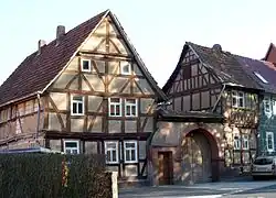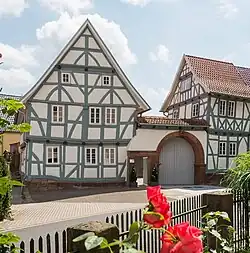 Zu Beginn des 16. Jahrhunderts wurde das heutige Gehöft erbaut. Es besteht aus einem Hauptgebäude und einem Nebengelass, dem sogenannten Altenteil. Beide Häuser sind durch eine Mauer mit großem rundbogigen Tor und einer links daneben angeordneten, rechteckig abgeschlossenen Tür verbunden, die in den zwischen den Häusern liegenden Innenhof führen. Die Eingänge werden von Buntsandstein umrahmt. Der Stürzriegel verzeichnet die Jahreszahl 1775. Das zweigeschossige Haupthaus hat eine Grundfläche von ca. 12,30 × 6,90 m und ein Satteldach zur Straße. Das ebenfalls zweigeschossige Nebengebäude ist schmäler und traufseitig angeordnet. Nach stilgeschichtlichem Befund wurden beide Häuser im 16. Jahrhundert erbaut und gelten als die ältesten Bauten des Ortes. Die Verstrebungen sind gebogen und verzapft, das Altenteil zeigt im Obergeschoss Andreaskreuze als Stilmerkmale "Fränkischen Fachwerks".