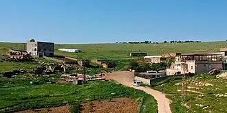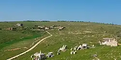 Blick auf einem jesidischen Friedhof, dahinter liegt das Dorf Koçan