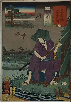 - Utagawa Kuniyoshi: Takamiya - Kamiya Iemon. Kisokaidō rokujūkyū tsugi no uchi - 65 (高宮・神谷伊右エ門 – 木曾街道六十九次之内, Nr. 65; „Takamiya, Kamiya Iemon – Die neunundsechzig Poststationen der Kisokaidō-Straße, Nr. 65“) 1852, aus einer Serie von Ōban, Soroimono