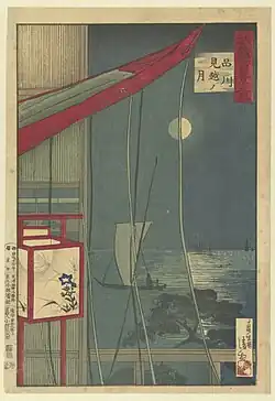 - Kobayashi Kiyochika: Aus der Serie: Hundert Ansichten von Musashi (Musashi Hyakkei no Uchi / 武蔵百景之内), 1884–1885, Ōban, Soroimono mit ca. 34 Teilen[4]