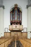 Nach unterschiedlichen Quellen wurde entweder 1773 oder 1775 in der Kirche eine erste Orgel installiert. Der Kaufpreis in Höhe von 300 Dukaten wurde aus den königlichen Steuereinnahmen des Ortes finanziert. Über die Jahrhunderte, bei den häufigen Kirchenschäden und schließlich bei dem Kirchenbrand 1950, wurde die Orgel unspielbar. So erwarb die Kirchengemeinde ein neues Instrument, das im Jahr 1952 in der Orgelwerkstatt von Willem van Leeuwen hergestellt worden war.[5] Die Größe und der Prospekt sind dem früheren Instrument nachempfunden. Sie wird vom Wappen des Prinzen Willem V. geschmückt. Hierbei handelt es sich um das Originalteil der ersten Orgel, das beim Brand von 1950 eingelagert gewesen war. Die Orgel verfügt über mechanische Schleifladen, hat 19 Register auf zwei Manualen und Pedal.[6] Die Disposition lautet wie folgt:[7]