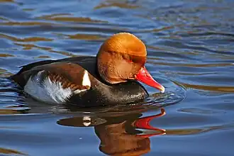 • Die Kolbenente (Netta rufina) ist eine etwa stockentengroße Vogelart aus der Familie der Entenvögel (Anatidae). Sie zählt zu den Tauchenten und kann bis zu 30 Sekunden unter Wasser bleiben. Das Männchen ist im Prachtkleid mit seiner fuchsroten Kopffärbung und dem karminroten Schnabel unverkennbar.