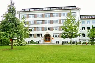 1925 begannen die Schulbrüder in Illertissen mit dem Unterricht an ihrer von 1923 bis 1925 erbauten Ordensschule. Die Nationalsozialisten nutzten das Schulgebäude und das Kloster ab 1936 als Schulungsheim für den Reichsarbeitsdienst (RAD).[2] Im Februar 1945 wurde die aus Breslau nach Bad Altheide und von dort mit einem Lazarettzug nach Bayern evakuierte Univ.- Kinderklinik in den Räumen der RAD-Führerinnenschule untergebracht. Im Oktober 1945 wurden die Räume wieder für den Schulbetrieb freigegeben, die Kinderklinik zog weiter nach Bad Grönenbach[3].