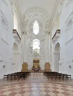 Die Kirche wird innen mit einem hoch aufragenden Tonnengewölbe in Kreuzform mit Kolossalpilastern und einer zentralen Tambourkuppel überwölbt, wobei der Bau durch die vier hohen die Hauptkuppel umrahmenden Hauptkapellen zu einem Zentralbau vereinheitlicht wird. Diese in den Kirchbau einbezogenen offenen Kapellen mit ihren Altären prägen neben dem Hauptaltar das Kircheninnere. Die beiden mittigen Querschiffaltäre sind mit je einem Altarblatt von Johann Michael Rottmayr ausgestaltet. Sie zeigen den damals wichtigsten Stadtheiligen Karl Borromäus bei Pestkranken und den Mönchsvater Benedikt, heidnische Fürsten taufend. Alle Altäre sind Werke des Hoftischlers Simon Thaddäus Baldauf (1677–1753) aus Au am Inn, und des Fassmalers Peter Paul Perwanger.