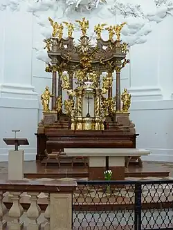 Der heutige Hochaltar wurde von Pater Bernard Stuart entworfen und von Josef Anton Pfaffinger ausgeführt. Das Programm des Hochaltares stammt aus dem Alten Testament und bezieht sich auf einen Spruch Salomos (Spr 9,1 ): „Die Weisheit hat ihr Haus gebaut, ihre sieben Säulen behauen.“ Vor den Säulen stehen allegorische Figuren der Musik, Dichtung, Malerei und Baukunst sowie der vier Fakultäten. Darüber schweben Liebe und Hoffnung, beflügelt vom Glauben. Auf der Höhe des Gesimses stehen hier sieben Erzengel. Der Altar löst sich nach oben hin in die von Fischer von Erlach entworfenen Stuckfiguren auf. Er wiederholt die Hauptmotive der Kirche und führt sie weiter. Als oberster Abschluss des Chores erscheint vor dem hellen Fenster der Apsis umgeben von plastisch modellierten Wolken, zahlreichen Engeln und einem Strahlenkranz – gleichsam überirdisch – Maria Immaculata auf einer Mondsichel.