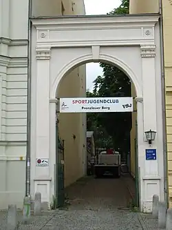 Im Zweiten Weltkrieg wurde der Schulbau in der Weißenburger Straße beschädigt[55] und anschließend mit Ausnahme der Turnhalle abgerissen. 1960 entstand im Rahmen des Nationalen Aufbauwerks ein langer Flachbau für eine Kegelbahn, daneben Klubräume und Ballspielplätze,[56] später genannt „Freizeitcenter“.[57] Seit Sommer 1993 ist die Anlage ein öffentlich geförderter Sportjugendklub,[58] auf der wettkampftauglichen Bohlebahn trainierte 2024 unter anderem der Sportverein der Berliner Verkehrsbetriebe.