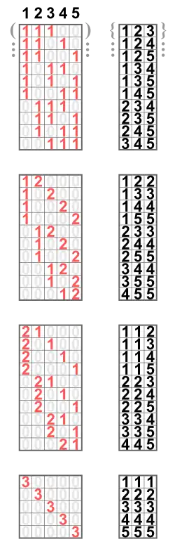 In der nebenstehenden Abbildung wird das Ergebnis für ausgewählte Elementen aus möglichen Elementen veranschaulicht, wobei die schwarzen Ziffern die Elemente der Auswahlmenge darstellen und die roten Ziffern jeweils die (wiederholt) gewählten Elemente zählen. Es ergeben sich somit mögliche Kombinationen.