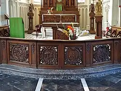 Die 17 Meter breite und 80 cm hohe Kommunionbank im Stil Louis-quinze besitzt Schnitzereien mit der Darstellung des Lebens Jesu Christi: Geburt, Fußwaschung, Kreuzigung und Himmelfahrt.