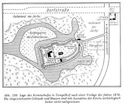 - ↑ Eine ähnliche erhöhte Randlage zum Dorfkern, geschützt durch einen See, findet sich auch in Britz.