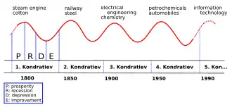 Die Kondratjew-Zyklen (ältere Transkription: Kondratieff-Zyklen) beschreiben den Kern einer von dem sowjetischen Wirtschaftswissenschaftler Nikolai Kondratjew entwickelten Theorie zur zyklischen Wirtschaftsentwicklung, die Theorie der Langen Wellen. Ausgangspunkt für die Langen Wellen sind Paradigmenwechsel und die damit verbundenen innovationsinduzierten Investitionen: Es wird massenhaft in neue Techniken investiert und damit ein Aufschwung hervorgerufen. Nachdem sich die Innovation allgemein durchgesetzt hat, verringern sich die damit verbundenen Investitionen drastisch und es kommt zu einem Abschwung. In der Zeit des Abschwungs wird aber schon an einem neuen Paradigma gearbeitet.[1] Ob diese Zyklen tatsächlich existieren und ob ein kausales Verhältnis zu den empirisch nur schwer zu identifizierenden Innovationszyklen besteht, ist umstritten.