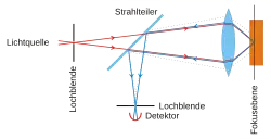 Das einfachste konfokale Verfahren ist sicherlich der konfokale Punktsensor, wie er schon von Marvin Minsky[1] patentiert wurde. An ihm lässt sich das Konfokale Grundprinzip am besten erläutern: Er besteht aus einer Lichtquelle, die eine sehr kleine Lochblende beleuchtet. Das Bild der Lochblende wird beugungsbegrenzt auf das Objekt in Form eines Airy-Scheibchens abgebildet. Das reflektierte und gestreute Licht von der Probe wird über einen Strahlteiler auf eine zweite Lochblende, hinter der sich ein Detektor befindet, abgebildet. Diese Anordnung sorgt dafür, dass Streulicht, das von der Probe außerhalb der Fokusebene zurückgeworfen wird, ausgeblendet wird. Dadurch misst der Sensor eine erhöhte Lichtintensität, wenn das Objekt im Fokus ist, detektiert aber keine Intensität, wenn sich das Objekt außerhalb des Fokus befindet. Ein Punktsensor kann sowohl mit Weißlicht als auch mit einem Laser aufgebaut werden.
